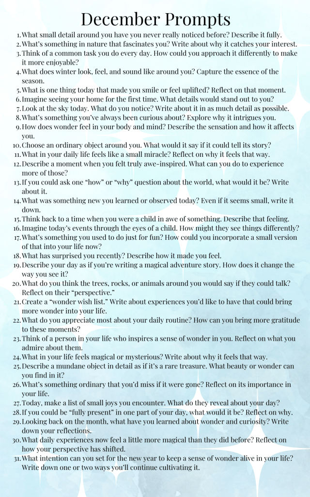December Daily Journal Prompts and Daily Numbers On November 30, 2024January 1, 2025 By 2ndhandspiritedIn Daily, December Daily, Intentions, journal, journal prompts, Memory Keeping, PlanningLeave a comment Dec Daily NumbersDownload December PromptsDownload